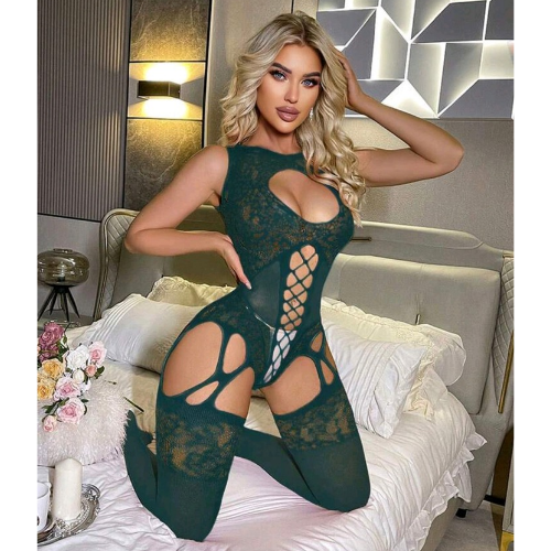 Gorgeous dark green front peep hole and cut out section crotch less body stocking