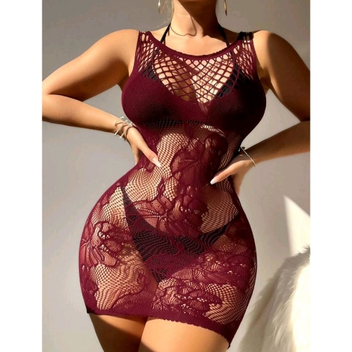 Beautiful burgundy floral fishnet body stocking dress with hollow out sections
