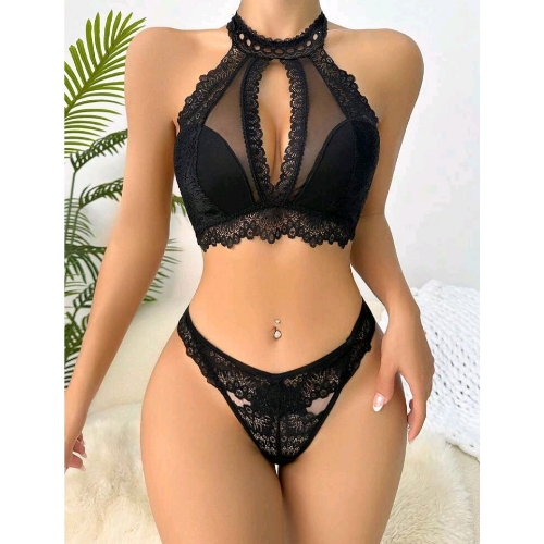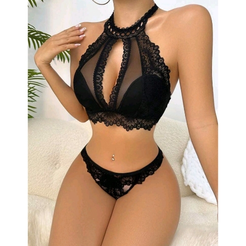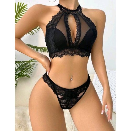 High Rounded Halter Neck Sexy Set in Mesh and Lace Trim (Black)