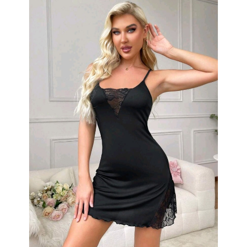 Black lettuce trim hemline nightdress with lace trim accents
