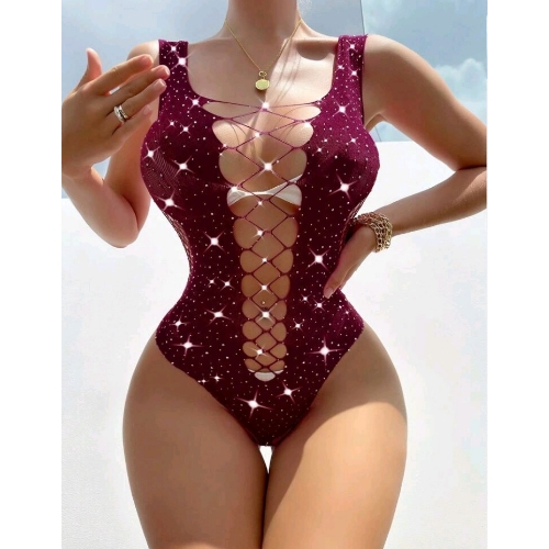 Rhinestone studded mesh front with crisscross detail teddy in gorgeous burgundy