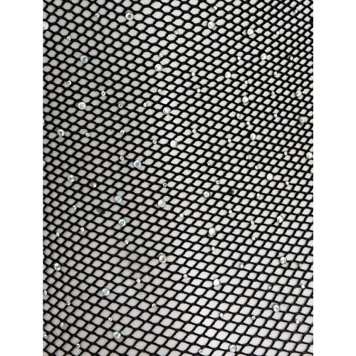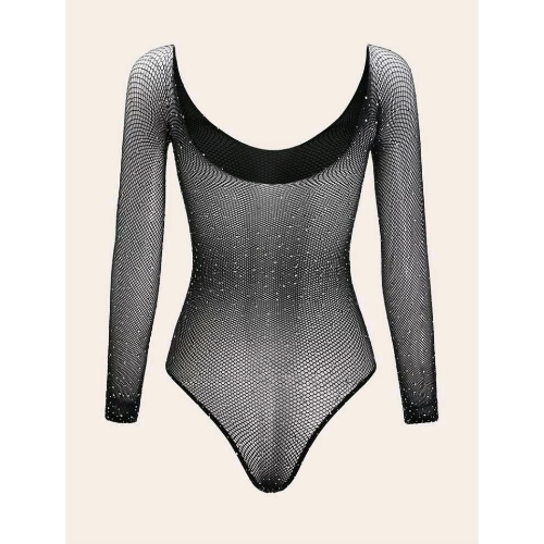 Rounded neckline long sleeve rhinestone detailed fishnet teddy