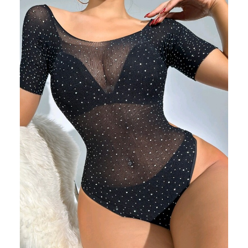 Short Sleeve Round Neckline Rhinestone Studded Teddy (Black)
