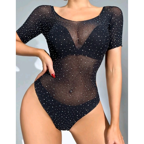 Beautiful black short sleeve round front and back neckline rhinestone studded teddy